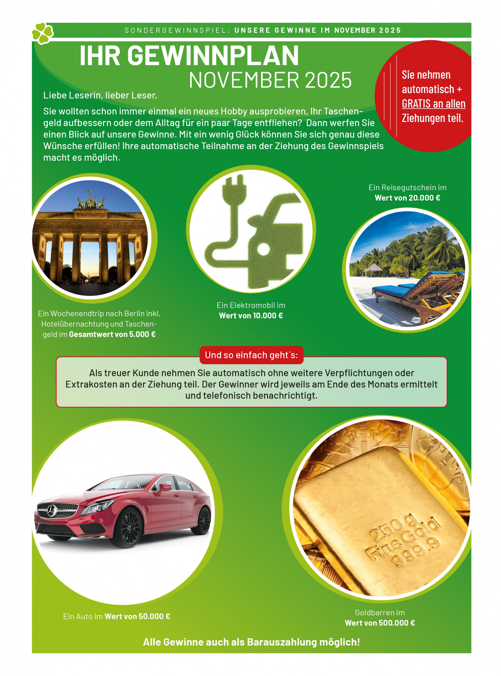 Im Glücksclub Deutschland haben Sie jeden Monat unzählige Chancen bei zahlreichen Gewinnspielen und Ziehungen zu gewinnen. Dabei können Sie diverse Preise, von attraktiven Sachpreisen bis hin zu hohen Geldbeträgen, ergattern.